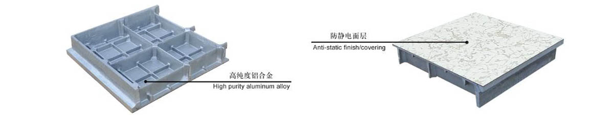 Aluminum alloy anti-static floor (including aluminum alloy ventilation plate) is completely made of aluminum alloy by negative pressure casting, which integrates the characteristics of corrosion resistance and high strength of aluminum alloy. It has the characteristics of high dimensional accuracy, good electrical conductivity, good fire resistance, antimagnetic and not easy to deform. Extremely stable performance, for the most reliable anti - static floor products.