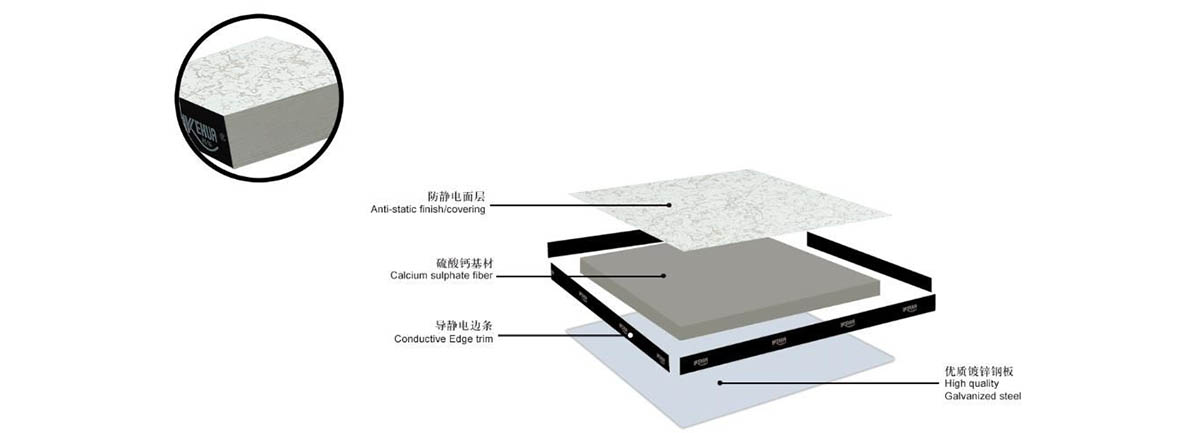 Calcium sulfate anti-static floor is made of non-toxic and unbleached plant fiber as reinforcement material, combined with solidified calcium sulfate crystal, and made by pulse pressing process. Floor surface is made of HPL melamine, PVC, ceramic tile, carpet, marble or natural rubber veneer, plastic edge strip around the floor and galvanized steel plate at the bottom of the floor. Because of its environmental protection, fire prevention, high intensity, level off and so on a lot of respects superiority, already became the material that overhead floor family uses most extensively. In developed country and area dosage is very big, already exceeded compound floor dosage becomes stylist the mobile floor that considers first. Calcium sulfate anti-static floor with calcium sulfate as the base material, the front and back of the floor with galvanized sheet bonding, surrounded by PVC edge, the floor is not easy to damp, not easy to deformation, longer burning time, long service life, the installed floor below the formation of a path, convenient floor below the line, line maintenance. Floor does not need to remove oil phosphating spray, flatness is good, the edge is not anti-warping, environmental protection, strength, sealing and stability.