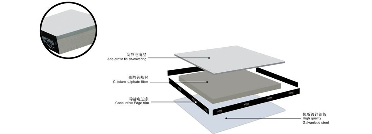 It is composed of surface layer, edge sealing, upper steel plate, filler, lower steel plate, beam and bracket. The edge seal is a conductive black tape (no edge seal on the floor). Surface layer: generally PVC, HPL or ceramic. Anti-static floor steel plate: high quality cold rolled steel plate, one stamping molding, high dimensional accuracy. Bottom steel plate: deep tensile cold rolled steel plate, bottom special pit structure, increase floor strength, multi-head spot welding, surface electrostatic painting treatment, corrosion and rust prevention. Kehua calcium sulfate anti-static floor is anti-static floor filled with calcium sulfate base material.